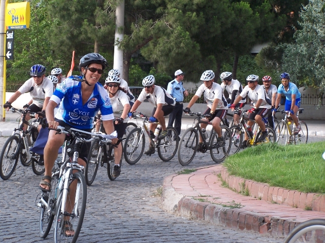 From a stage in the town square, Mustafa of the Izmir Bicycle Riders Club presented an impressive power point show and talked about the beauty of the bicycle – for health, for free transport, and to reduce carbon emissions. His presentation showed how peoples around the world – from Africa to New York to Asia – use the bicycle for work, commuting and leisure.