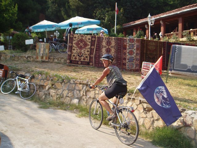 Except for one long climb over a mountain, the route was mostly flat and smooth cycling. AT the top of the mountain was a rest stop selling colorful Turkish rugs (kilim) that made for good photo opportunities.
